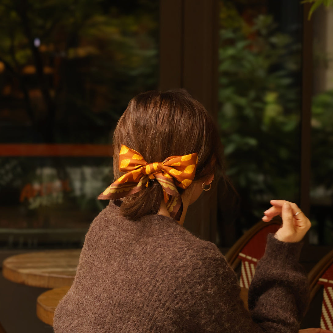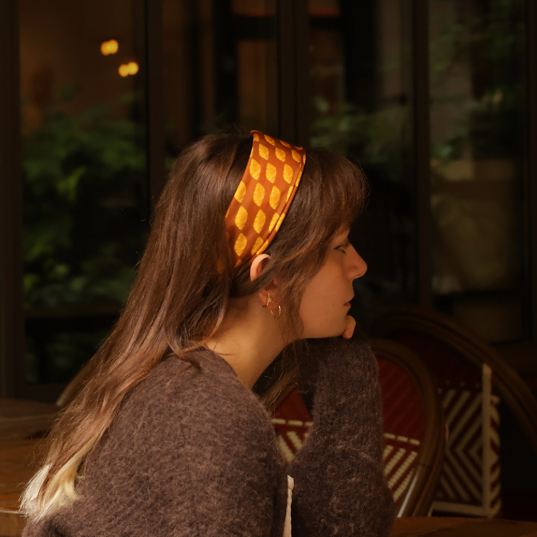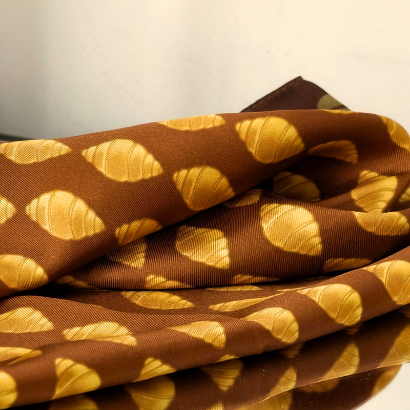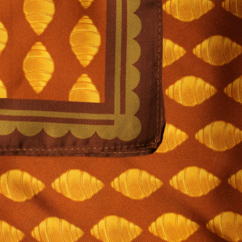 Symbole du matin français par excellence, le croissant se transforme en une œuvre d'art graphique sur notre petit carré de soie "Plaisir Coupable". Pièce audacieuse de la collection Les Gourmandises, ce foulard est un hommage vibrant à nos petites tentations quotidiennes.